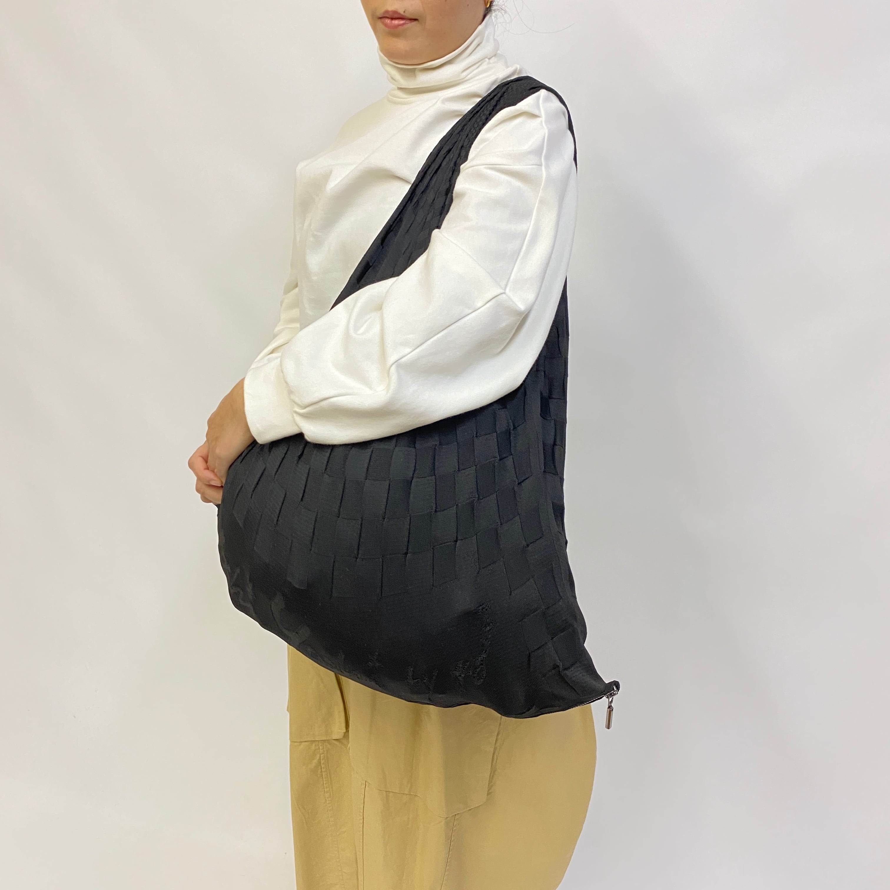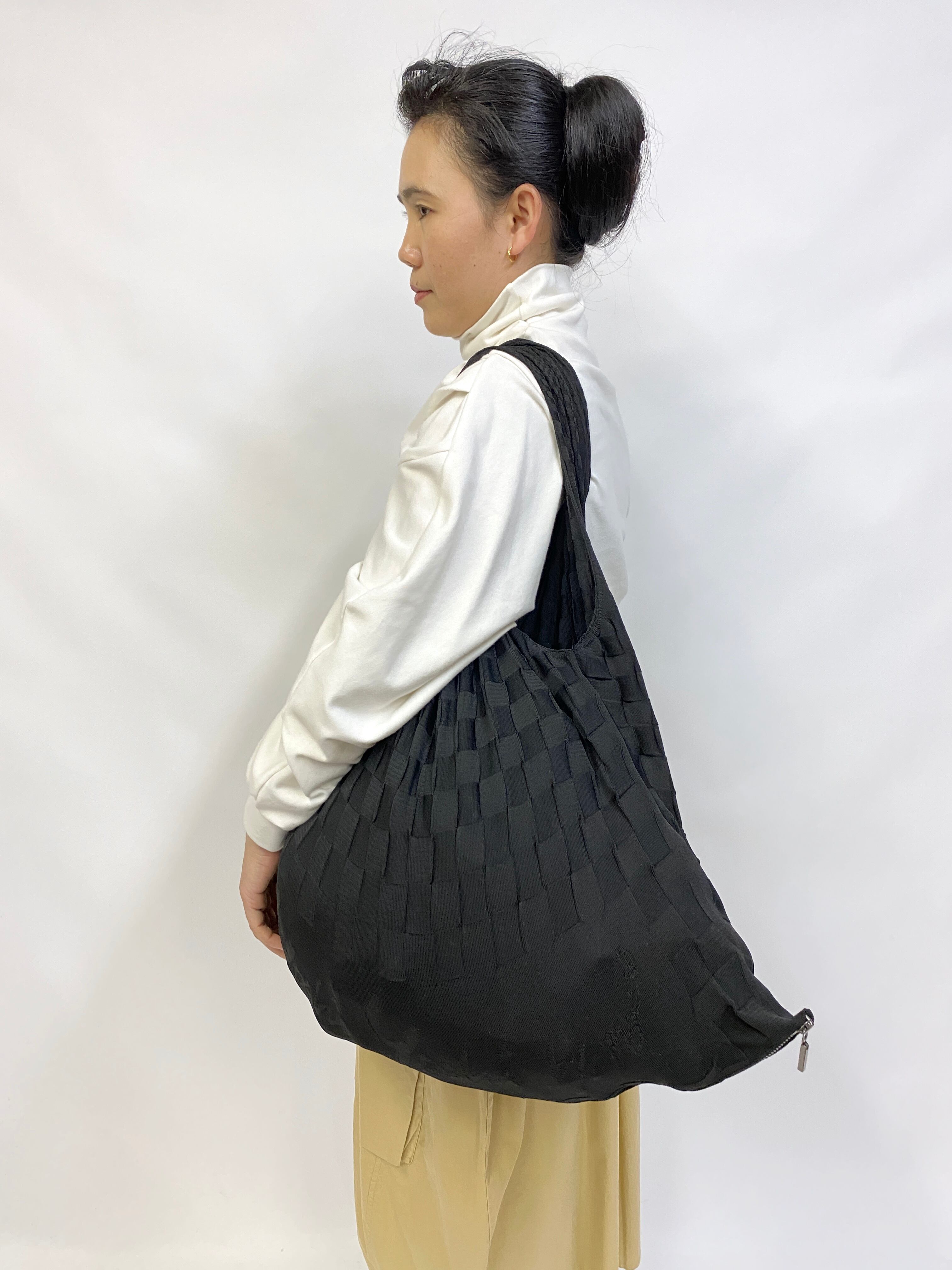 生地はストレッチ性の高いポリエステルの糸を使用し、物を入れた時生地が伸び、驚く程物が入ります。