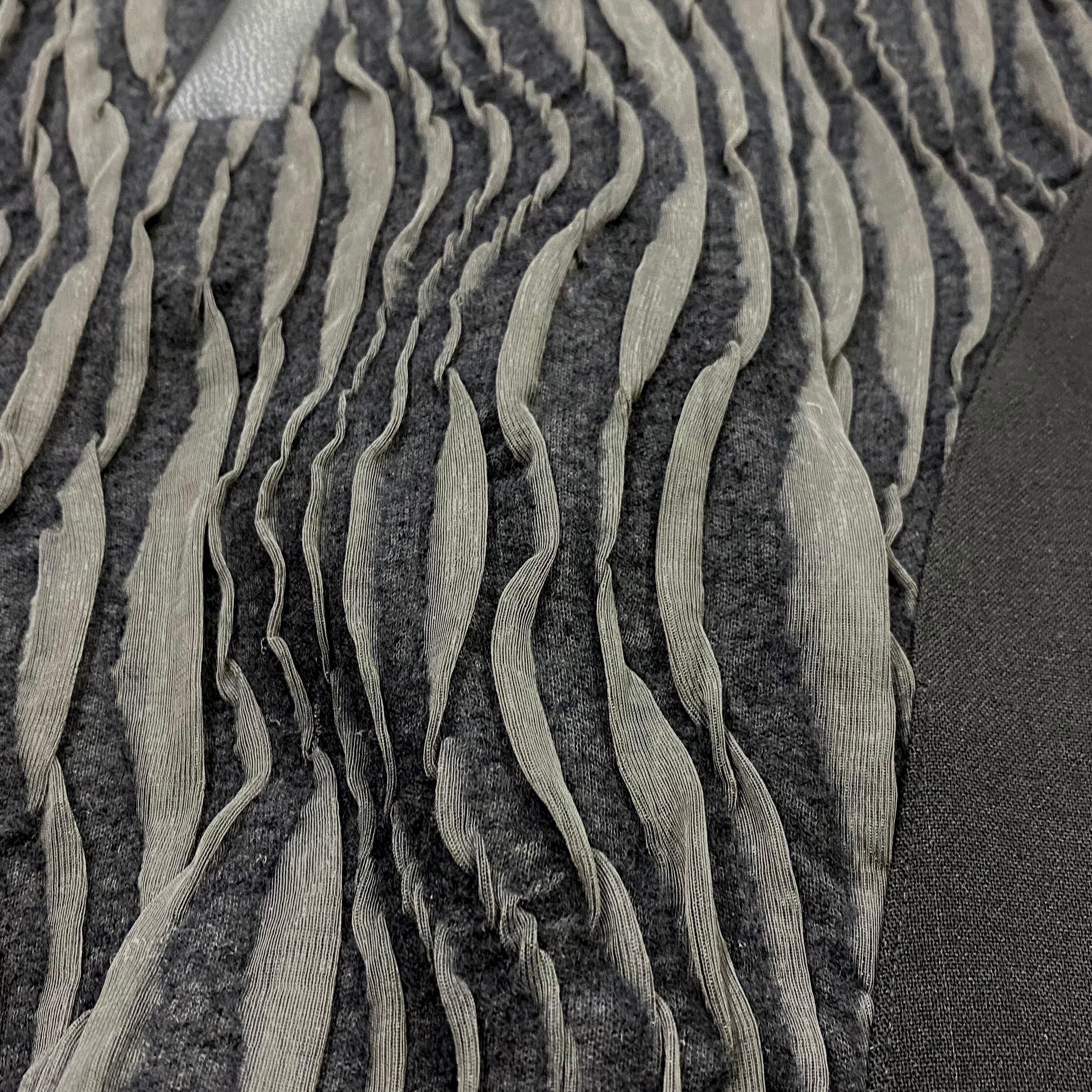 表面変化のある柄部分の生地は、裏側を毛、表側をナイロンのフィラメント糸で編み、さらにそれを縮絨をかけて毛を縮ませることで表のナイロンがぷくぷくと浮き立ち独特の表情をなす特殊な生地。