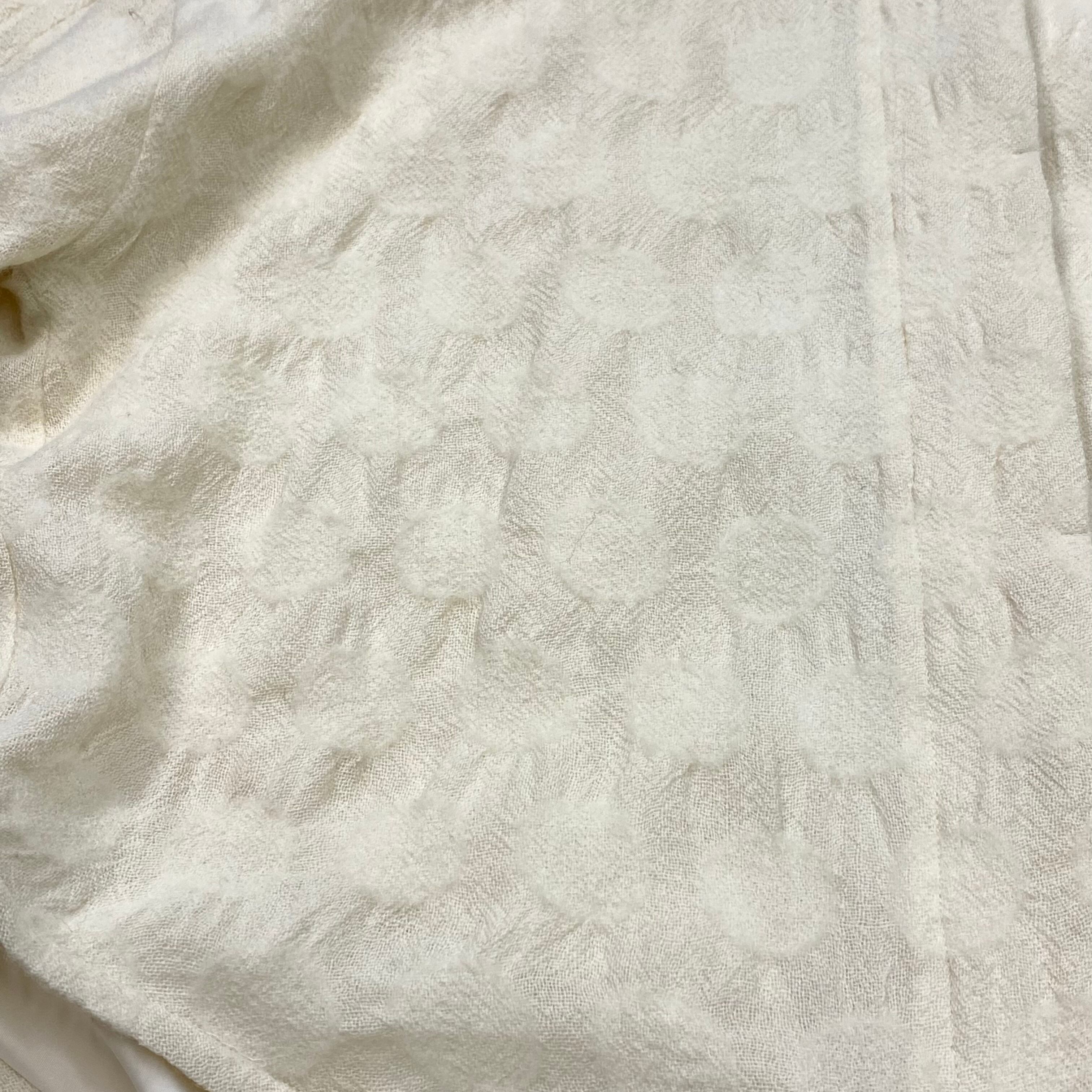 生地は毛100%のジャガード織りの一種で、ドットの丸の柄部分がダブルで厚くなっていて、ベースのシングル部分は軽く繊細な織り。グレード感のある雰囲気です。