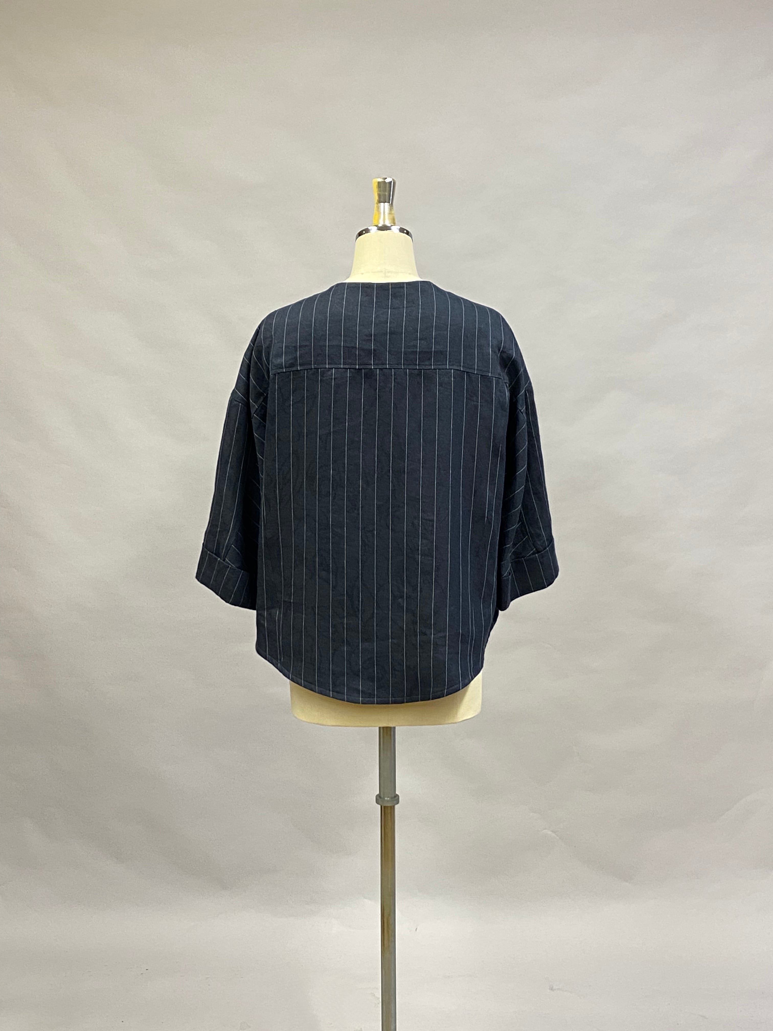 遊びのあるシルエットですが安易な印象にならないのはノーカラーデザインに、ボタンが隠れる比翼仕立てによるもの。ミニマルなデザインがさりげなくシックで洗練された雰囲気を演出します。