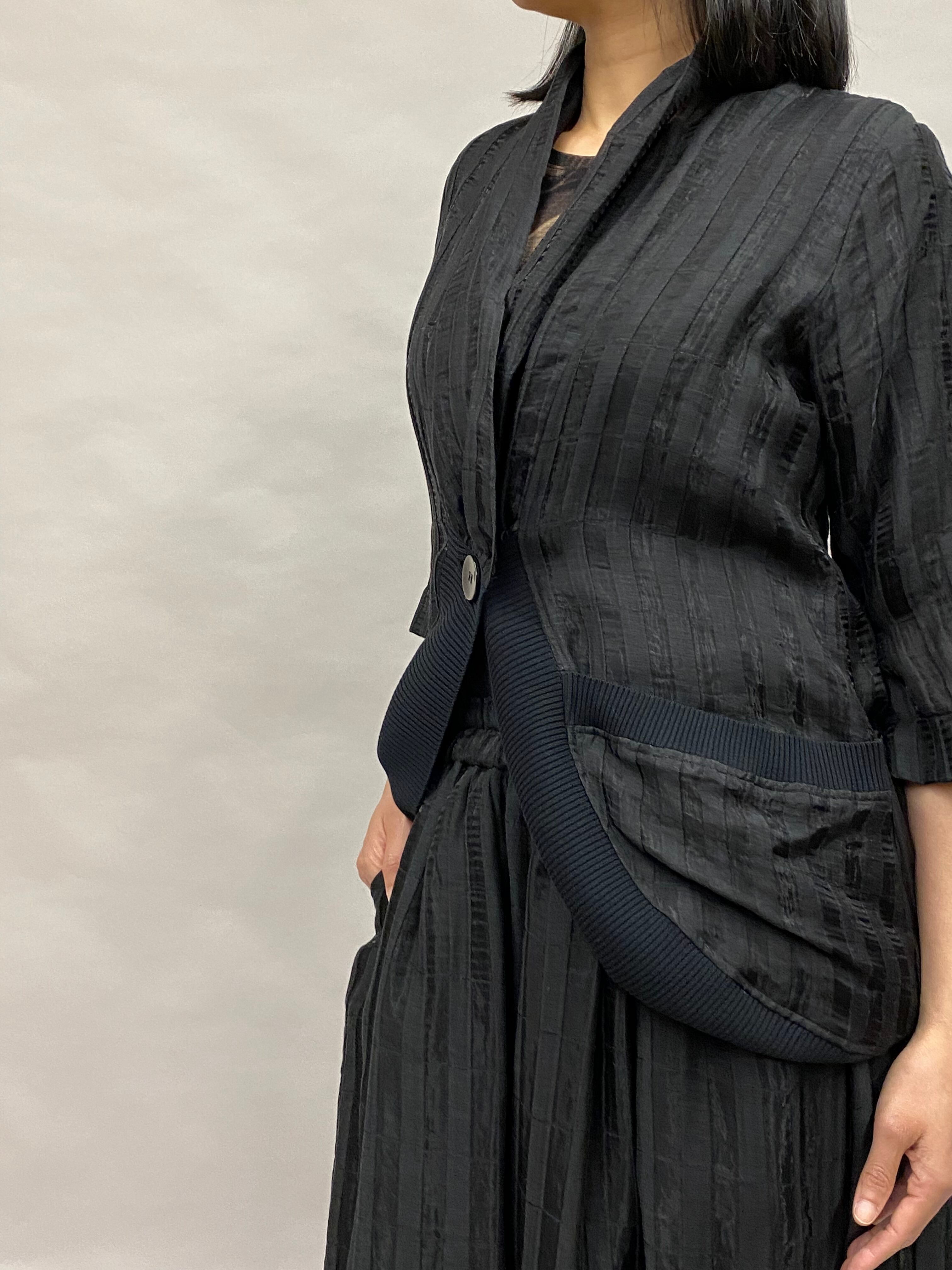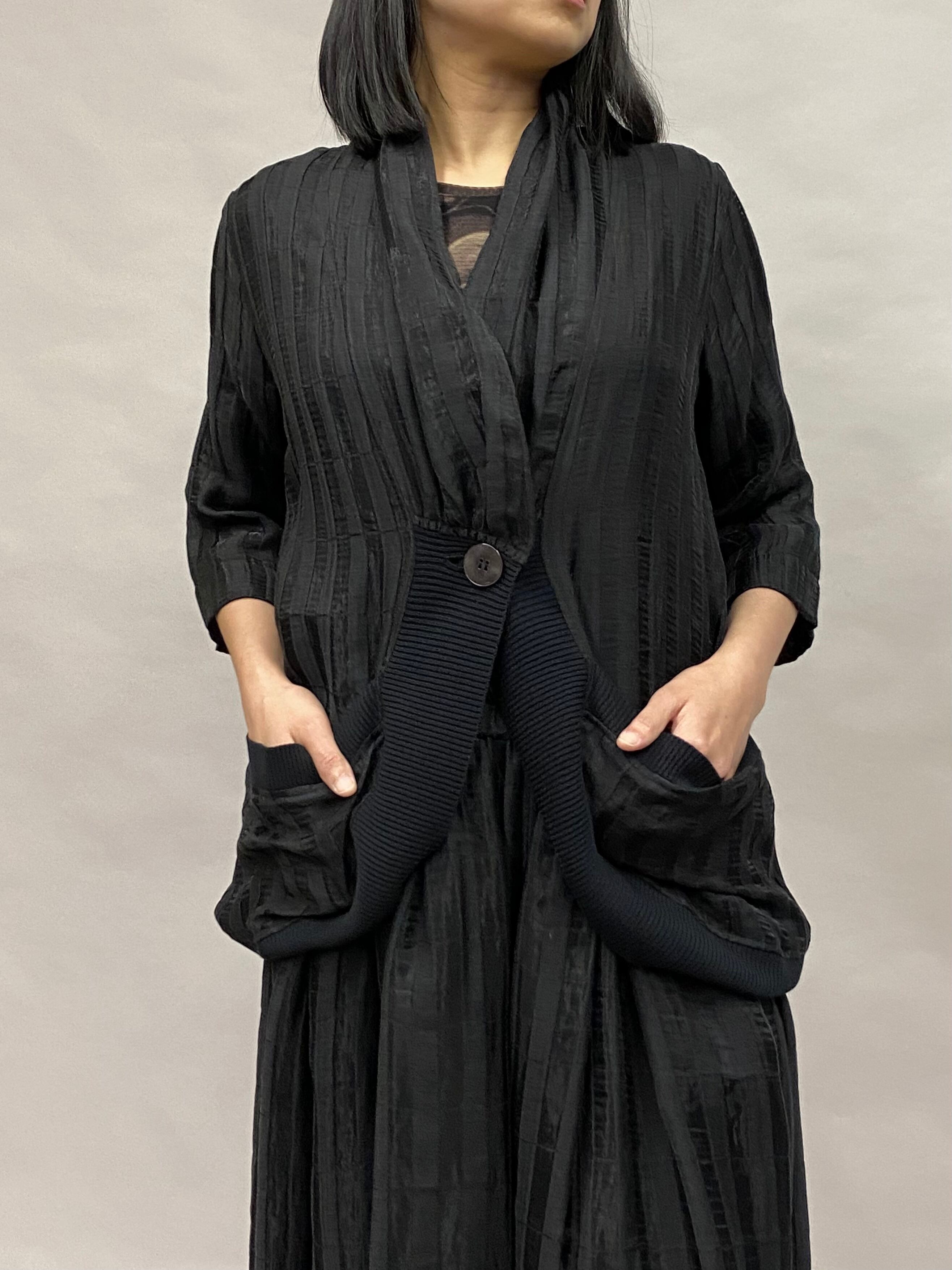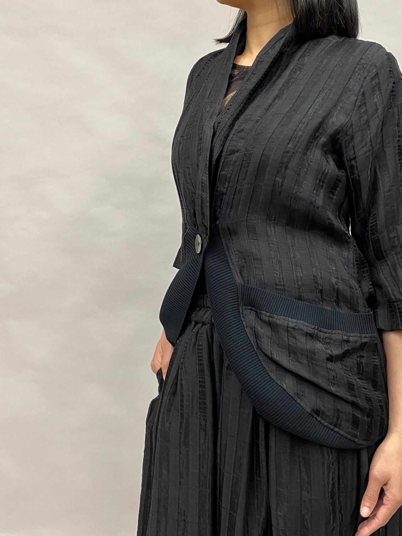 ふんわりと包み込むようなフォルムはウエストで少しシェイプを入れ、衿から流れるようにニットのリブをデザインしコクーンシルエットに。