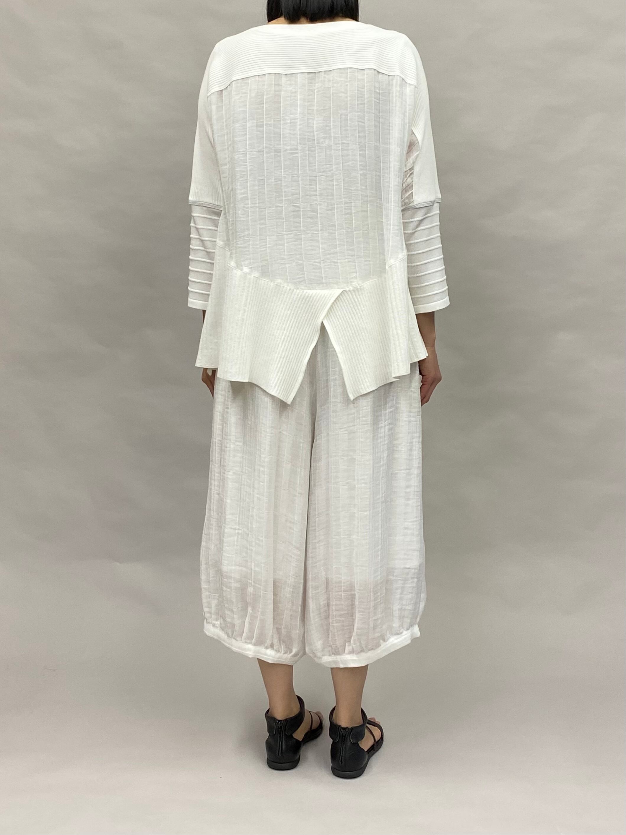 透け感のあるストライプ柄生地はセルロース系に、極細の合繊糸と『麻』を交織した柔らかくライトな生地。