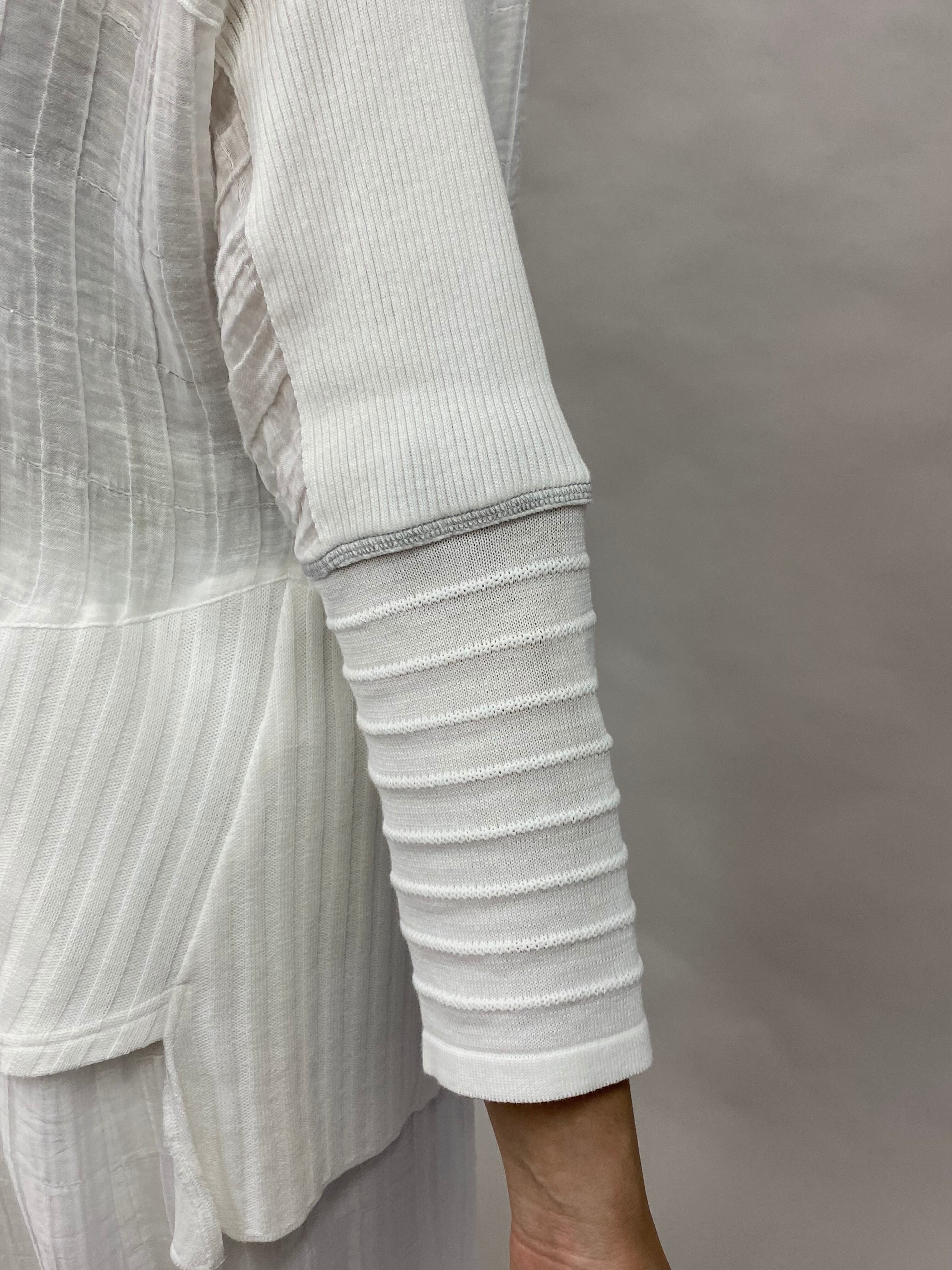 衿もとのデザインはインターシャ編みという特殊な編み組織で、ニット地に切れ目を入れたようなすっきりとした仕様に。